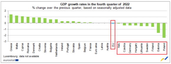 Effettivamente, dalla consultazione del comunicato ufficiale emerge un’altra e ulteriore verità: il dato (negativo) trimestrale messo a segno dall’intero Vecchio continente o più propriamente individuabile attraverso le due lettere “EU”. Per l’Europa, quindi, la sorte non è delle migliori: -0,1% la variazione dell’ultimo trimestre 2022 e soglia 1,7% quale livello su base annua. Consapevoli di ciò, ed estendendo pertanto l’analisi al più ampio e completo territorio europeo, la negatività riscontrata evidenzia un miglior ricalco sull’effettiva realtà economica appartenente al IV trimestre dello scorso anno.