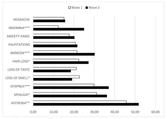 Figura 1 Incidenza % dei sintomi per l’ondata e differenza per ondata. L’incidenza è calcolata come numero di nuovi casi individuati da un sintomo rispetto ai pazienti complessivi malati di Covid-19 in ogni ondata. Gli asterischi segnalano se il sintomo è significativo rispetto ai pazienti complessivi dell’ondata. Sono esclusi i valori mancanti.