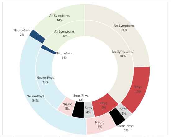 I principali sintomi riportati (>5% della popolazione) erano 11: dispnea, tosse, astenia, dolori muscolo-scheletrici, cefalea, palpitazioni, ansia/attacchi di panico, alterazioni del sonno, del gusto, dell’olfatto, perdita massiccia e circoscritta di capelli. Al fine di favorire la valutazione statistica, i sintomi della sindrome Long Covid sono stati raggruppati in tre macro-aree (o macro-sintomi): neurologica, comprendente cefalea, amnesia/disturbi della concentrazione, ansia/panico, insonnia e palpitazioni; sensoriale, comprendente ageusia e anosmia; fisica, comprendente dispnea, astenia e artromialgie). La perdita di capelli non è stata presa in esame per il suo scarso impatto sulla salute (fenomeno transitorio).
