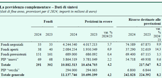 Le risorse destinate alle prestazioni accumulate dalle forme pensionistiche complementari alla fine del 2024 ammontavano, sulla base di dati ancora preliminari, a 243 miliardi di euro, corrispondenti al 10,8% del Pil e al 4% delle attività finanziarie delle famiglie italiane. Tali risorse erano così ripartite: ai fondi pensione negoziali circa 74,6 miliardi euro; ai fondi aperti a 37,3 miliardi; ai fondi preesistenti 69,4 miliardi. Le risorse dei PIP erano complessivamente pari a 61,5 miliardi di euro, inclusi 6,8 miliardi riferibili ai PIP “vecchi”.