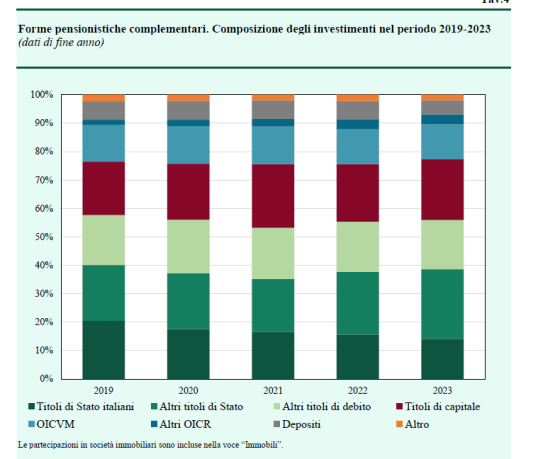 Infatti, i restanti 35,6 miliardi di euro, pur essendo comunque destinati a finalità pensionistiche, sono costituiti principalmente da riserve tecniche presso le compagnie di assicurazione. In generale, la composizione del portafoglio dei fondi è storicamente caratterizzata da una sostanziale stabilità.