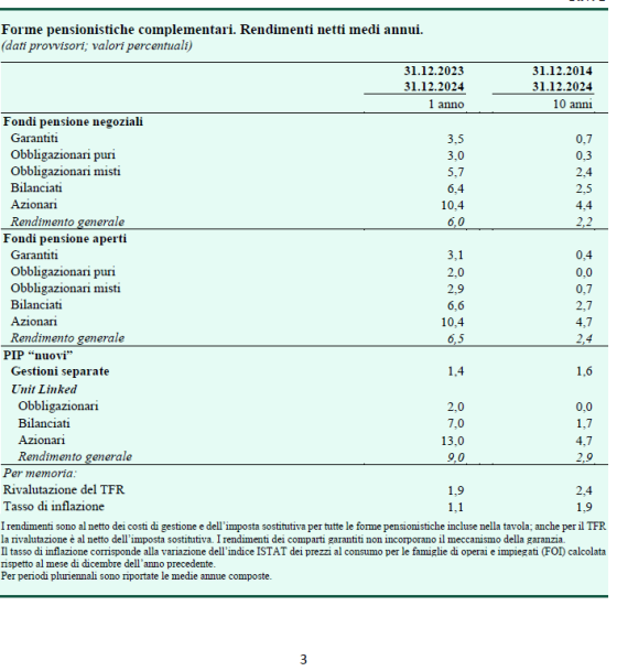 Quanto ai rendimenti delle forme di previdenza complementare, nel 2024 si sono riscontrati risultati positivi, come già nell’anno precedente, con valori più elevati per le gestioni con una maggiore esposizione azionaria.