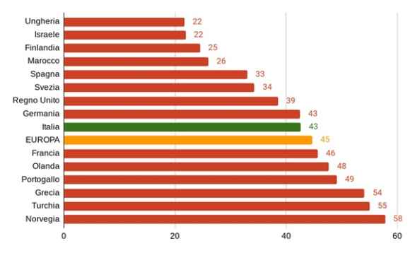 Nell’ultima settimana solo tre dei Paesi europei e mediterranei di grandi o medie dimensioni risultano aver registrato un numero di volo pari ad almeno la metà di quelli della settimana corrispondente dello scorso anno: Norvegia, Turchia e Grecia. Altri tre Paesi risultano su valori superiori alle media europea del 45%: Portogallo, Olanda e Francia. Italia e Germania sono appaiate al 43% e poco al di sotto della media europea. Va peggio la Spagna (33%) assieme a Paesi nordici come la Svezia (34%) e la Finlandia (25%). Chiudono la classifica, appaiate al 22%, Israele, in pieno lockdown a causa della recrudescenza del contagio, e l’Ungheria che ha scelto di chiudere le sue frontiere per proteggersi dal virus.