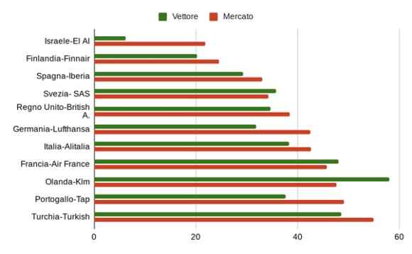 Anche Lufthansa risulta aver recuperato meno voli rispetto all’intero mercato tedesco: nella prima settimana di ottobre essa era solo al 32% dei suoi voli dell’anno prima contro il 43% dell’intero mercato. Lo stesso per quanto riguarda British Airways, col 35% dei voli rispetto al 39% del mercato. Vi sono poche eccezioni di compagnie che hanno recuperato più dei loro mercati: Air France (48% contro il 46% del mercato) e soprattutto Klm, il vettore che è risalito di più, col 58% rispetto al 48% del mercato. Anche SAS risulta al di sopra del sopra del livello del mercato svedese, ma essa in realtà essa copre anche il mercato norvegese, che guida la classifica dei paesi nel Grafico 1, e quello danese.