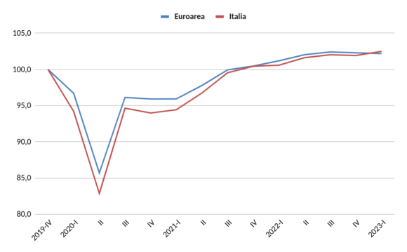 Vediamo più in dettaglio. Se le economie europee, nonostante la fine dell’emergenza Covid, fossero ancora zoppicanti e lontane dal pieno recupero dei livelli di attività pre-pandemia, allora si giustificherebbe il proseguimento di Next generation Eu secondo l’ampiezza e il finanziamento originario. In questo caso avrebbe ragione la politica fiscale espansiva e torto quella monetaria restrittiva. Se invece le economie fossero in rapida crescita e ormai ben distanti dai livelli pre-Covid allora probabilmente avrebbe ragione la politica monetaria restrittiva e torto quella fiscale espansiva. Dunque per dirimere la questione non ci resta che analizzare i numeri economici dell’Eurozona, in primo luogo il Pil reale.