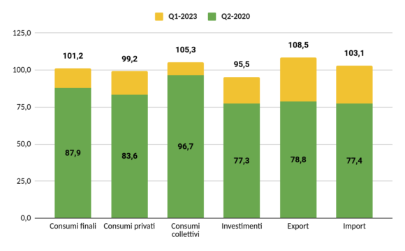 Possiamo anche andare a vedere in dettaglio le diverse componenti della domanda aggregata nell’Eurozona. Il Grafico 2 le riporta come numero indice, ponendo sempre uguale a 100 il livello pre covid di fine 2019 ed evidenziando per ognuna di esse il livello minimo raggiunto all’apice del Covid alla metà del 2020 e il valore più recente, quello del primo trimestre 2023.