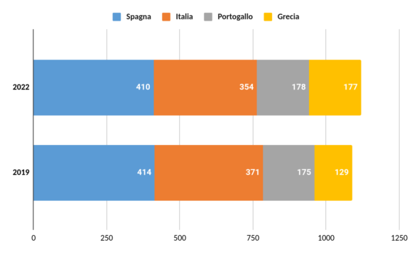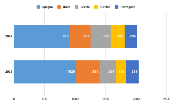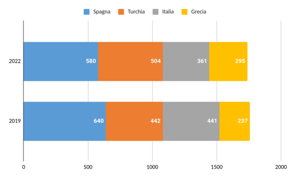 Possiamo dunque sostenere che vi siano due turismi che appaiono vincenti in questa estate 2022 e sono quello greco e quello turco. Vi sono invece due turismi all’apparenza meno dinamici e sono quello spagnolo e quello italiano, mentre il turismo verso il Portogallo si colloca esattamente a metà strada.