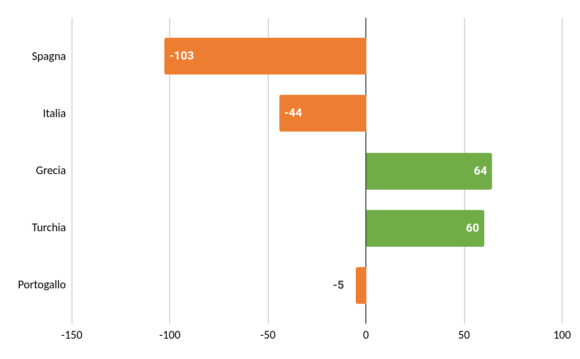 Questi dati confermano quanto risultava chiaro già dall’analisi iniziale: la ripresa del turismo post-Covid registra nel Mediterraneo due sistemi turistici vincenti, e sono quello greco e quello turco, e due sistemi turistici che appaiono invece in affanno, e sono quello spagnolo e quello italiano. Il Portogallo si colloca a metà strada, con un completo recupero del traffico aereo pre-Covid e dunque presumibilmente anche dei flussi turistici.