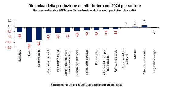 Nei primi nove mesi del 2024 la produzione manifatturiera scende del 3,4%, con cali più pesanti e più ampi della media per la moda (-10,8%) e per i settori della meccanica rappresentati da mezzi trasporto (-9,2%), macchinari e impianti (-4,2%) e metallurgia e metalli (-3,7%). I fattori globali determinano una caduta della produzione di dimensione europea (-4,6% per moda e meccanica nell’Ue a 27), ma in Italia la crisi è più severa (-5,5%).