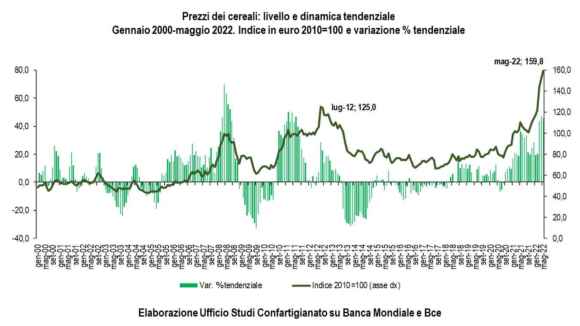 Cibo – La guerra sta determinando rilevanti effetti su scala globale nella filiera agroalimentare, con Russia e Ucraina che concentrano il 28,5% del mercato delle commodities agricole. La crisi dei prodotti agricoli vede esposti numerosi Paesi a basso reddito in Africa, Medio Oriente e Asia centrale, con accentuazioni nel caso di scarsità della produzione interna. Per i paesi più dipendenti dalle forniture russe e ucraine è a rischio la sicurezza alimentare, con gravi ripercussioni sociali e una intensificazione dei flussi migratori. Lo shock d’offerta si sta riverberando sui prezzi lungo la filiera alimentare. A maggio 2022 le quotazioni in euro dei cereali sui mercati internazionali salgono del 45,2%, superando del 27,9% il precedente picco di dieci anni fa (luglio 2021). Ad aprile i prezzi alla produzione del settore alimentare salgono del 14,5%, mentre a giugno i prezzi al consumo dei beni alimentari lavorati crescono dell’8,2%, 6,2 punti in più del 2% registrato a dicembre 2021.