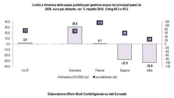 Acqua – La crisi idrica causata dalla siccità amplifica le tensioni in campo energetico e in quello agroalimentare. Mentre la sostituzione delle commodities energetiche provenienti dalla Russia richiede di massimizzare l’energia generata da fonti rinnovabili, la produzione idroelettrica nei primi cinque mesi del 2022 crolla del 39,7%. Il nostro Paese, inoltre, è fortemente esposto alla carenza idrica: l’Italia, con 9,2 miliardi di metri cubi, è al primo posto in Ue 27 per acqua dolce prelevata per uso potabile. L’agricoltura è il più grande utilizzatore di acqua, con consumi di 11,9 miliardi di metri cubi destinati all’irrigazione dei terreni e alla zootecnia. Un razionamento delle forniture idriche avrebbe ripercussioni anche nella manifattura: nei primi dieci comparti manifatturieri per intensità di utilizzo dell’acqua, come evidenziato nell’ultima analisi dell’Ufficio Studi di Confartigianato, operano 118mila imprese con 1 milione 268mila addetti, oltre un terzo (34,1%) dell’occupazione manifatturiera. La difficoltà ad affrontare l’emergenza idrica consegue a una bassa e decrescente spesa pubblica per la gestione dell’acqua: per questa posta l’Italia spende 26 euro all’anno per abitante, circa un terzo dei 72 euro della media Ue e in dieci anni questa voce di spesa si è ridotta del 32,9%, mentre in Francia è stata costante (+0,1%) e in Germania è salita del 30,6%.