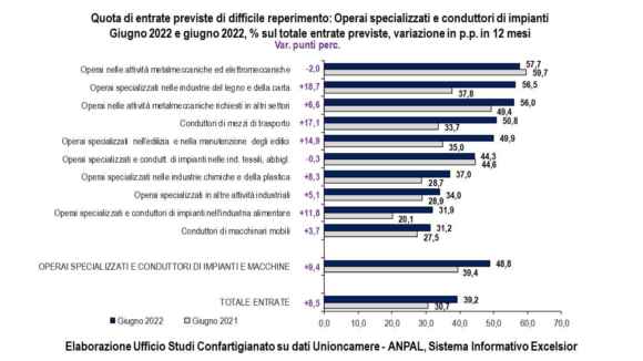 Lavoro – Il mercato del lavoro ha quasi completamente recuperato i livelli pre-pandemia – a maggio 2022 gli occupati sono lo 0,2% in meno rispetto a febbraio 2020 – con gli effetti della crisi interamente caricati sul lavoro indipendente, in flessione del 3,7%. La crescita della domanda di lavoro dipendente è caratterizzata da un aumento della difficoltà di reperimento di operai specializzati, che a giugno 2022 sale al 48,8%, 9,4 punti in più rispetto ad un anno prima, un aumento pressoché interamente determinato dalla mancanza di candidati (+9,2 punti). Mentre è difficile trovare personale nelle imprese, si assiste al paradosso di 1 milione 114 mila giovani under 35 che non studiano, non cercano lavoro e non sono disponibili a lavorare, di cui 294 mila uomini e 820 mila donne.