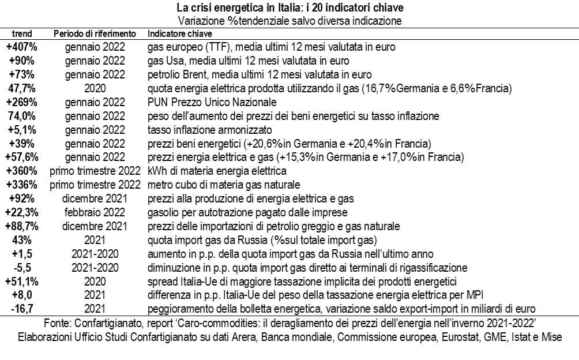 La crisi energetica dell’inverno 2021-2022 – La guerra russo-ucraina si intreccia con la crisi energetica già in corso, delineata dalle 20 evidenze statistiche, proposte nel report “Caro-commodities: il deragliamento dei prezzi dell’energia nell’inverno 2021-2022” che Confartigianato pubblica nei prossimi giorni, e caratterizzata dalla più elevata crescita dei prezzi dell’energia dopo quelle del 1974 e del 1979, anni di inflazione “a doppia cifra”.