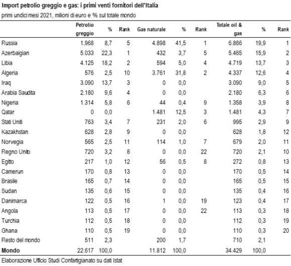 Il commercio estero con la Russia – Nel 2021 l’Italia ha un interscambio commerciale con la Russia di 7.696 milioni di euro di esportazioni e di 13.984 milioni di euro di importazioni, di cui i due terzi sono costituiti dalle commodities energetiche. La Russia è il primo fornitore dell’Italia di petrolio greggio e gas naturale, con una quota del 19,9%, davanti ad Azerbaigian con 15,9%, Libia con 13,7%, Algeria con 12,6%, Iraq con 9,0%, Arabia Saudita con 6,3%. Quote più contenute per Nigeria (3,9%), Qatar (4,3%), Stati Uniti (2,9%) e Kazakhstan (1,8%).