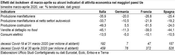 I dati statistici resi disponibili negli ultimi giorni, ed elaborati nel 6° report Covid-19 appena pubblicato dall’Ufficio Studi di Confartigianato, consentono di valutare l’intensità degli effetti del lockdown di marzo e aprile nei diversi settori, con interessanti confronti internazionali. Nella lettura dei dati va tenuto presente che l’Italia a fine marzo era il primo paese al mondo per numero di morti da Covid-19, a fine aprile risultava il secondo, dietro agli Stati Uniti.