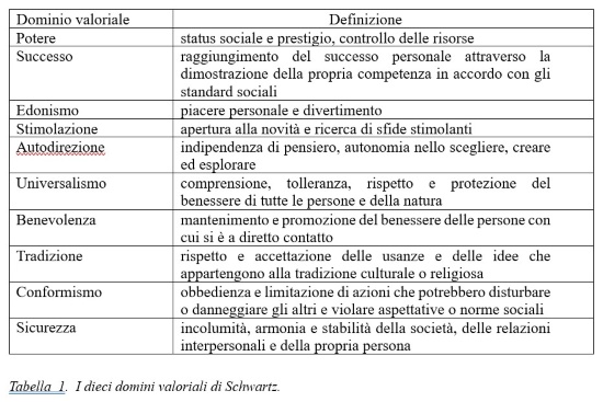 Uno dei riferimenti teorici più noti e utilizzati per comprendere di quali valori siano portatori le persone è la teoria della struttura universale dei valori di Schwartz e collaboratori (1992). Quest’autore definisce i valori come “ampi obiettivi comuni a diverse situazioni e tempi […], che fungono da principi guida del comportamento” e, sulla base dei risultati ottenuti in ricerche condotte in oltre sessanta paesi, li ha articolati in dieci dominii motivazionali, riportati nella Tabella 1: