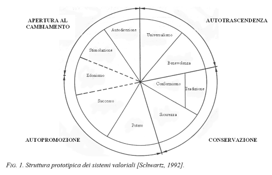 Secondo Schwartz, tra i dieci dominii valoriali si svilupperebbero relazioni di tipo dinamico. Ad un livello di base, i valori formerebbero un continuum motivazionale rappresentabile attraverso una struttura circolare, in cui i valori adiacenti sono tra loro compatibili e quelli in posizioni opposte risultano tra loro in conflitto. Ad un livello di ordine superiore, l’opposizione tra i valori viene schematizzata collocando gli stessi lungo due dimensioni ortogonali e bipolari (vedi Figura 1): la prima pone in contrasto l’apertura al cambiamento (stimolazione, autodirezione) e la conservazione (tradizione, conformismo, sicurezza), la seconda contrappone l’autopromozione (potere, successo) all’autotrascendenza (universalismo, benevolenza).