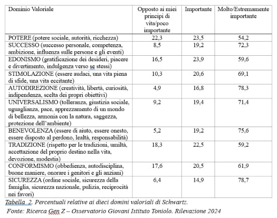 Gli/le adolescenti italiani/e percepiscono parimenti importante un dominio legato alla conservazione e uno legato all’apertura al cambiamento, indicando chiaramente il desiderio e la volontà di innovare, il bisogno di indipendenza, la curiosità, tutti tratti tipici di questa fase, ma anche la volontà di restare ancorati ad un contesto che offre sicurezza in virtù del suo essere la prima fonte di apprendimento (la famiglia), garante dei diritti e dei doveri di tutti (la sicurezza nazionale), promotore e artefice di forme di convivenza sociale all’insegna della reciprocità (l’ordine sociale). Questa coppia di valori dominanti acquista maggior significato e chiaro orientamento dalla considerazione del fatto che ad essi si aggiunge la benevolenza: sentirsi sicuri e divenire indipendenti si giustappone all’essere prosociali, onesti, leali, disposti al perdono e alla responsabilità. A seguire, per questa generazione, si trova il desiderio di successo personale.
