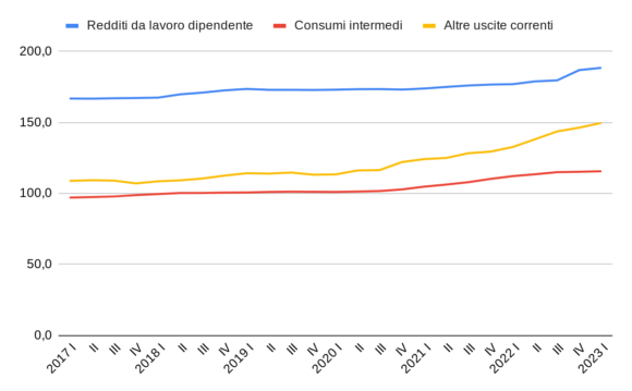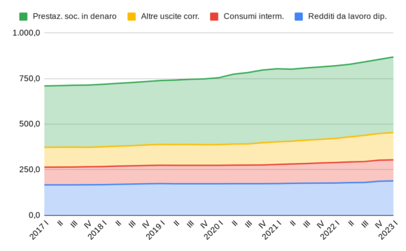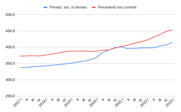 Iniziamo allora a esaminare l’impatto del Covid su queste quattro voci e la loro evoluzione nei periodi più recenti, tuttavia iniziando dalle tre più piccole (ma si fa per dire) dato che esse possono essere visualizzate assieme nel Grafico 1 (mentre la maggiore, la spesa per le erogazioni sociali in denaro, è quasi uguale alla somma delle tre). Tutti i dati utilizzati nei grafici che seguono rappresentano, al fine di evitare gli effetti della stagionalità, la somma delle spese dei quattro trimestri terminanti nel trimestre indicato. Pertanto l’ultimo dato disponibile, quello del primo trimestre 2023, riporta la spesa pubblica del periodo aprile 2022-marzo 2023.
