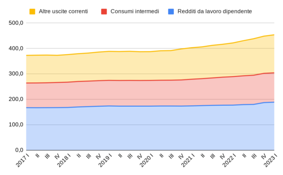 Le restanti quattro macrovoci compongono la cosiddetta spesa pubblica primaria (primaria vuol dire al netto degli interessi sul debito) e sono: i) il costo del lavoro dei dipendenti pubblici; ii) l’acquisto sul mercato di beni e servizi intermedi (queste due voci servono per produrre i servizi pubblici della Pa); iii) le erogazioni sociali in denaro (dunque pensioni, assegni e in generale gli strumenti del welfare diversi dalle erogazioni in natura); iv) infine, le altre spese di parte corrente.