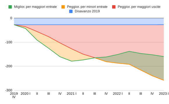 – 231 miliardi di maggiore spesa pubblica meno 99 miliardi di maggiori entrate determinano un peggioramento del disavanzo pubblico di 132 miliardi, corrispondenti a circa sei punti percentuali e mezzo in termini di Pil;