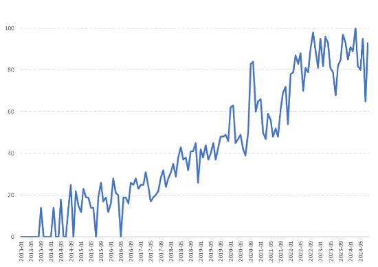 A dimostrazione di questo crescente interesse, si osservi il grafico che mostra il trend del volume delle ricerche su Google Web Search per le parole chiave “Sports Data Science” (Area geografica: mondo; Categorie di Google: tutte) nel periodo da gennaio 2013 ad agosto 2024 (fonte: Google Trends; il valore è normalizzato su una scala da 0 a 100, dove ogni punto è diviso per il più alto volume assoluto di ricerca nel periodo considerato e i valori 0 indicano volumi al di sotto di una determinata soglia).