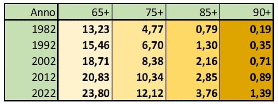 Tabella 1. Andamento nel tempo della proporzione di persone con più di 65, di 75, di 85, di 90 anni. Fonte Istat.