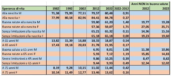 Tabella 2. Andamento nel tempo di alcuni indicatori della speranza di vita, e anni di vita attesi in condizioni di salute non buone. Distinzione tra maschi e femmine. Fonte Istat.