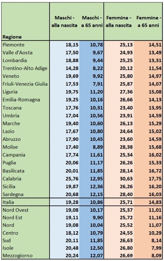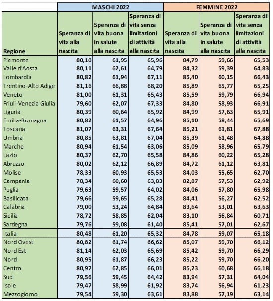 Istat mette anche a disposizione i dati fin qui presentati suddivisi per regione: a titolo di esempio nel seguito vengono riportati i valori degli indicatori relativi all’anno 2022, suddivisi per genere. Per i maschi (tabella 3) la speranza di vita alla nascita va dagli 81,16 anni del Trentino Alto Adige e 81,07 della Toscana ai 78,34 della Campania e 78,33 del Molise. Per quanto riguarda la speranza di vita in buona salute alla nascita si va dai 66,88 anni del Trentino e 63,81 dell’Umbria ai 58,55 della Sicilia e 53,24 della Calabria. La speranza di vita senza limitazioni di attività alla nascita varia tra i 68,20 del Trentino e 67,64 della Toscana e i 62,04 della Sicilia e 61,40 della Sardegna. In termini di macroaree territoriali tutti gli indicatori di speranza di vita sono più elevati al Centro-Nord e più bassi al Sud.