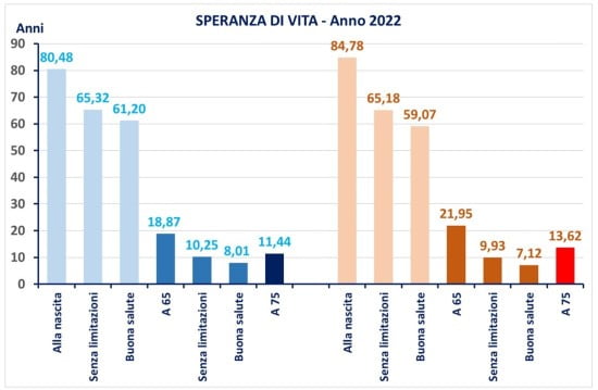 Negli ultimi 40 anni la lunghezza della vita attesa media alla nascita nella popolazione italiana è aumentata di 9,1 anni per i maschi e di 7,8 anni per le femmine, e lo stesso si è verificato a 65 anni con valori assoluti ovviamente inferiori (uomini +5, donne + 4,5) ed a 75 anni (uomini +3,2, donne +3,5). Non abbiamo una serie altrettanto lunga nel tempo per gli altri due indicatori ma i dati dell’ultimo decennio dicono che lo stesso fenomeno riguarda anche la speranza di vita in buona salute e quella senza limitazioni nelle attività. Non solo, la tabella ci dice anche che la speranza di vita in buona salute sta aumentando di più della speranza di vita complessiva, soprattutto tra le donne. Inoltre, mentre per l’attesa di vita complessiva sono le donne ad avere la vita più lunga, quando si passa all’attesa di vita in buona salute o in assenza di limitazioni la situazione si inverte e sono i maschi ad avere una vita in salute più lunga di quella delle femmine. La figura 1 cristallizza graficamente questo risultato in relazione ai dati dell’anno 2022.