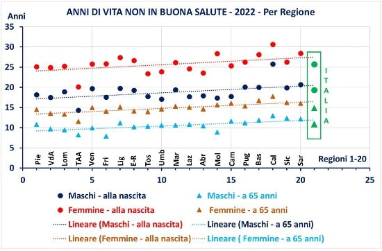 Pure per le singole regioni è possibile calcolare gli anni medi attesi di vita non in buona salute: la tabella 4 li presenta suddivisi per genere e con gli indicatori calcolati sia alla nascita che a 65 anni, sempre per l’anno più recente disponibile (2022). I 19,8 anni del totale italiano per i maschi alla nascita sono la composizione tra le regioni che hanno valori più bassi (Trentino 14,28; Umbria 17,04; …) e quelle che hanno valori più alti (…; Sardegna 20,78; Calabria 25,76); e lo stesso succede per le femmine con una media di 25,71 anni (Trentino 20,12; Toscana 23,40; …; Sardegna 28,40; Calabria 30,63). In termini di macroaree geografiche gli anni di vita non in buona salute sono maggiori nel Mezzogiorno rispetto al Centro-Nord.