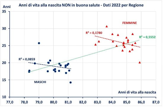 Figura 3. Relazione tra la speranza di vita alla nascita e gli anni di vita non in buona salute. Dati riferiti alle singole regioni. Anno 2022. Fonte Istat.