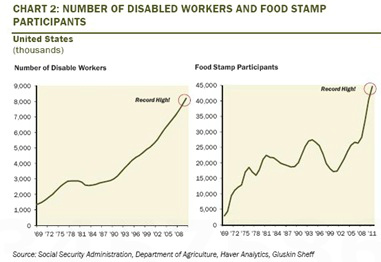 I problemi non sono solo in Cina alle prese, tra l’altro, con una bolla immobiliare che non ha niente da invidiare a quella spagnola e con un calo delle esportazioni che minaccia la “tranquillità sociale”; i problemi europei, o dell’euro, che finiscono un giorno sì e l’altro pure su FT e Wall Street Journal non possono far cadere l’oblio sui problemi che l’economia americana sta attraversando. Il numero di persone che negli Stati Uniti riceve un sussidio per invalidità (SSDI – Social Security Disability Insurance) è salito del 22% da dicembre 2007 con un incremento di 1,6 milioni di persone; la percentuale di persone tra i 25 e i 64 anni che ricevono i sussidi di invalidità è salita dal 4,5% del 2007 al 5,3% attuale. Ovviamente che l’incremento abbia coinciso con la crisi economica non è in alcun modo casuale e presumibilmente la spiegazione non è diversa da quella rintracciabile in fenomeni del tutto simili avvenuti, per esempio, nelle regioni italiane con l’economia più fragile. Ad aprile più di 46 milioni di americani hanno ricevuto un aiuto dal governo per l’acquisto di cibo (food stamps); la spesa per il governo su questo versante negli ultimi quattro anni è più che raddoppiata a 75,7 miliardi di dollari. Non occorre essere stimati macroeconomisti o vincitori di premi Nobel per capire che non sono segnali di salute economica ferrea.