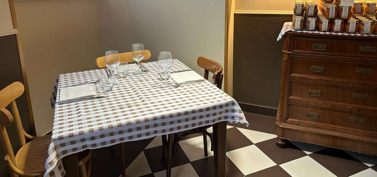 L’osteria sta lì, nella piazza principale. Si apre con una veranda vetrata ove sono esposte due magnifiche affettatrici Berkel, una rossa e una bianca. All’interno, una saletta in cui il sapore di trattoria è ricercato coi tocchi sapienti delle tovaglie e dei runner a quadri bianchi e marroni; dal pavimento marmoreo a scacchi; dalla lavagna coi piatti del giorno; dalle credenze d’antiquariato che creano un clima casalingo.