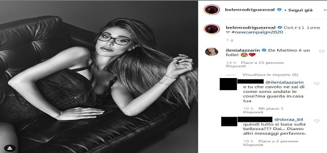 Di fronte all’immagine in bianco e nero di Belen Rodriguez, sdraiata su un divano con gli occhiali da vista, Ilenia Lazzarin non ha resistito e ha commentato il post con parole che non sono passate inosservate agli occhi dei tanti followers della showgirl argentina. “De Martino è un folle”, ha scritto l’attrice di Un posto al sole lasciando intendere che non si può lasciare una donna bella e sensuale come la Rodriguez. Parole che hanno scatenato la pronta reazione del popolo del web. Da una parte ci sono quelli che si sono detti d’accordo con la Lazzarin e, dall’altra, ci sono quelli che hanno criticato l’attrice. “Quindi tutto si basa sulla bellezza? Dai, diamo altri messaggi per favore”, ha scritto una follower della Rodriguez.