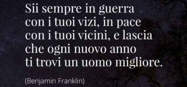 In un’altra foto, invece, un pensiero rivolto ad una persona a noi vicina, e alla sua famiglia. Nello scatto si legge infatti la frase: “Auguro un felice anno nuovo, pieno d’amore e di pace, a te e a tutta la tua famiglia!”. Anche in questo caso la foto può essere spedita via chat sull’applicazione di messaggistica WhatsApp, ma anche via social, come ad esempio Facebook e Instagram, oppure, come post a se stante, per un augurio generico rivolto a tutti i nostri follower. Infine l’ultima foto, che è un po’ diversa rispetto alle altre due, in quanto non è strettamente inerente l’anno nuovo. Si tratta infatti di una bella citazione di Benjamin Franklin, fra i padri fondatori degli Stati Uniti, che un tempo disse: “Sii sempre in guerra con i tuoi vizi, in pace con i tuoi vicini, e lascia che ogni anno ti trovi un uomo migliore”. Una frase di buon auspicio che si presta, come quella precedente, a molti usi. La si può infatti utilizzare come foto da spedire via chat, oppure, come scatto da pubblicare sulle proprie pagine social.