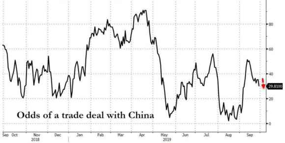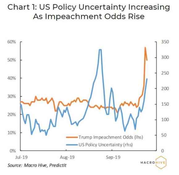 Ma anche per l’America, il tempo dei giochini di prestigio sta finendo. Se si arriverà alla finora minacciata implementazione dei dazi, il potere d’acquisto degli americani sarà colpito. Pesantemente. E, in contemporanea, cominceranno i default di massa dei produttori agricoli, soprattutto nel Mid-West e in Florida, strategici per Donald Trump se davvero vorrà tentare la carta delle rielezione. Che fare, quindi? Perché al di là delle criticità politico-economiche che un inasprimento della guerra commerciale avrebbe per entrambi i contendenti, c’è quella suprema a cui far riferimento: buybacks a parte (i quali, però, necessitano di liquidità che comincia a scarseggiare, come mostrano le aste Fed in corso), chi opererà da driver di Wall Street, da qui alle presidenziali? Ce lo dicono questi altri due grafici, i quali svelano il segreto di Pulcinella: la telenovela dell’impeachment, tanto incredibile quanto perfetta. Per due motivi: ha un iter lunghissimo e, anche se finirà in nulla come con Bill Clinton, garantirà mesi di instabilità e continui stop-and-go e colpi di teatro.