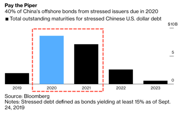 Secondo, l’anno prossimo la Cina dovrà affrontare scadenze obbligazionarie corporate interne per 8,6 miliardi di dollari, oltretutto da parte di aziende già oggi così indebitate che il rendimento minimo garantito dai loro bond viaggia attorno al 15%, come mostra questo grafico: anche la carta strategica dello yuan debole ha i mesi – forse le settimane – contati, perché con una moneta svalutata quello stock già enorme diverrebbe insostenibile. E una catena di default aziendali non è un buon biglietto da visita, tanto più che invece Donald Trump avrebbe tutto da guadagnare, visto che quei tremori in seno all’economia cinese comparirebbero in piena campagna elettorale, garantendogli il profilo del vincitore del conflitto commerciale.