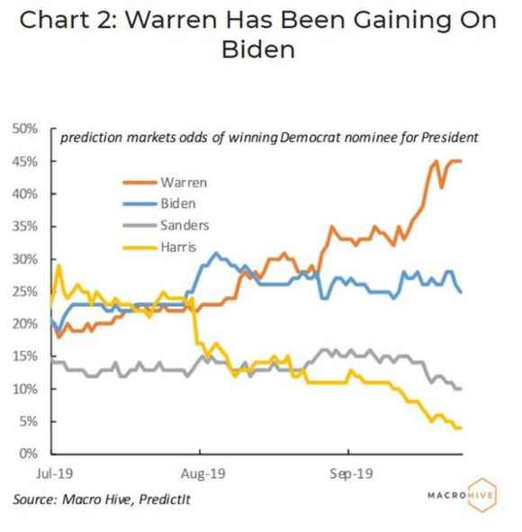 E il secondo grafico appare rivelatore, così come lo strano timing scelto per l’esplosione – quasi dal nulla – del caso Ucraina che sembra poter potenzialmente travolgere la Casa Bianca. Ovvero, subito dopo la vittoria della candidata democratica di sinistra, Elizabeth Warren, proprio sul comprimario della vicenda e principale competitor designato nella lotta per la presidenza, Joe Biden, nello Stato “termometro”dell’Iowa. E chi opera sui mercati è certo: se la procedura avrà inizio formale già questa settimana come pare e si arriverà a una guerra politica dichiarata, chi rischia di lasciarci le penne è proprio Joe Biden, visto che al di là delle colpe da dimostrare del figlio in seno ad affari in Ucraina, è l’intera gestione del caso Kiev fatta dall’amministrazione Obama-Clinton a rischiare di finire nel mirino (e sui giornali). E gli analisti sono altresì certi che se l’ex vice-presidente dovesse crollare nei consensi e, magari, addirittura essere obbligato al passo indietro, il fatto che la nomination rischi di finire in pasto a una candidata smaccatamente anti-Wall Street come Elizabeth Warren si tramuterebbe in un assist insperato e risolutore per Donald Trump, trasformato di colpo nel proverbiale “male minore”.