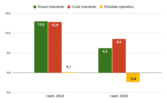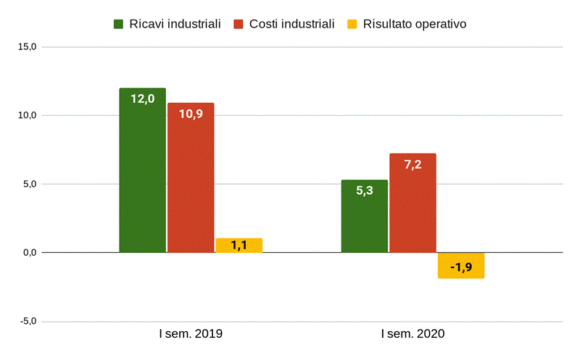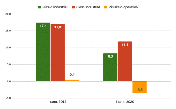 1) I ricavi industriali si sono più che dimezzati nel primo semestre 2020 rispetto allo stesso semestre del 2019, scendendo da 17,4 a 8,3 miliardi di euro (-52%).