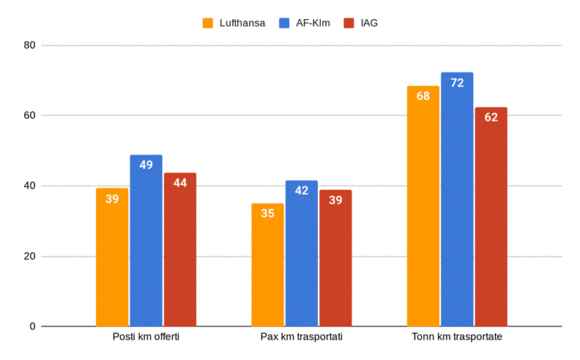 1) I tre gruppi mostrano una riduzione dei costi industriali molto simile: del 31% per Lufthansa, del 33% per AF-Klm e del 34% per IAG.