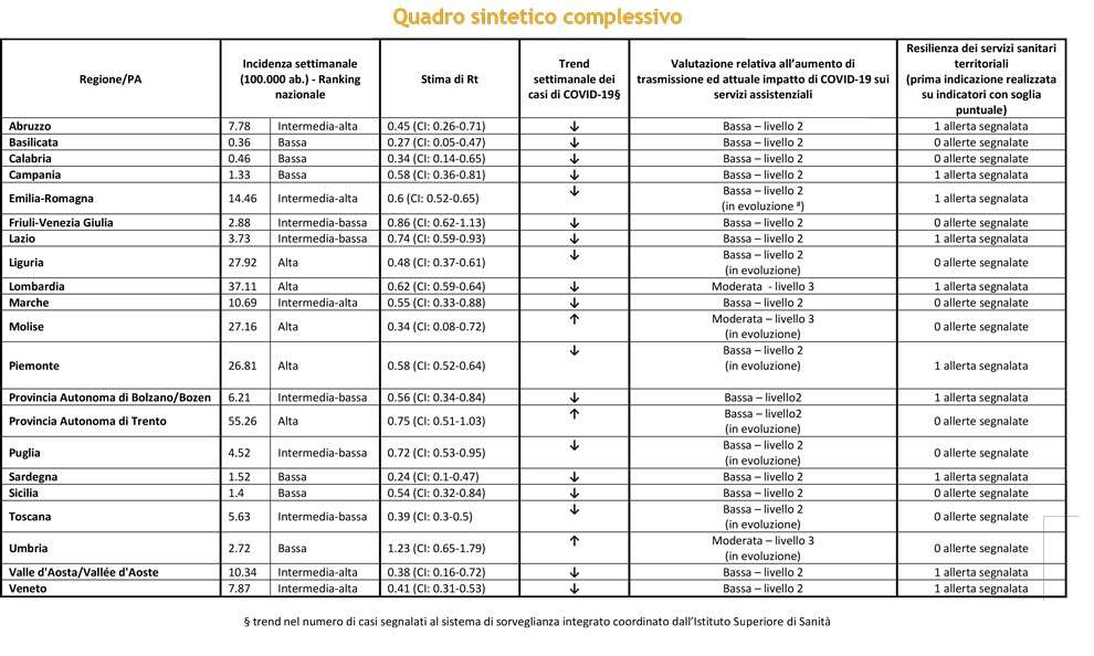 Buone notizie anche per la Lombardia, anch’essa al livello 3 (classificazione moderata) in base all’indice Rt, il che significa un miglioramento rispetto all’emergenza durata per mesi. In Lombardia infatti “si assiste a una riduzione di segnali di sovraccarico del servizi sanitari. Rimane elevato il numero di nuovi casi segnalati ogni settimana seppur in diminuzione”. La conclusione del report conferma che “le misure di lock-down in Italia hanno permesso un controllo dell’infezione da Covid-19 sul territorio nazionale pur in un contesto di persistente trasmissione diffusa del virus, con incidenza molto diversa nelle regioni”.