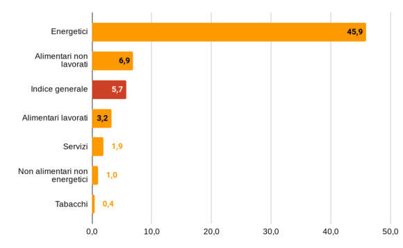 Al di fuori dei beni energetici, la crescita più consistente è quella degli alimentari, con i non lavorati, gli agroalimentari (da +5,3% a +6,9%), più dinamici dei lavorati (da +2,2% a +3,2%).