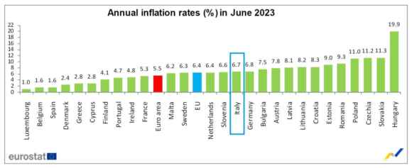 L’inflazione è ancora in calo. Eurostat, attraverso il dato pubblicato ieri, ha confermato la precedente stima che vede a giugno una generalizzata flessione del valore annuale dei prezzi al consumo. La percentuale della più circoscritta Zona euro registra una percentuale al 5,5% rispetto al 6,1% di maggio. Medesimo parallelismo temporale, ma, contestualizzato al più vasto territorio europeo (rif. Ue), la variazione annua si ferma a quota 6,4% anch’essa in diminuzione se confrontata al 7,1% del mese precedente. L’Italia, beneficiando del suo 6,7% (dal precedente 8%), si affianca agli altri (numerosi) Paesi europei che gravitano nel range compreso tra il sei e il sette per cento facendo meglio della “rivale” Germania che si arena al 6,8%.