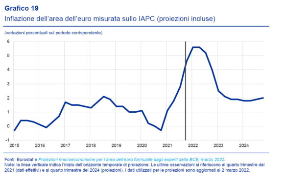 Tralasciando per un breve momento questa volontà purista di voler inquadrare l’eventuale numero sul periodo di riferimento, nello stesso Bollettino viene già anticipata la possibile debacle inflazionista dei giorni nostri: «Le proiezioni macroeconomiche formulate dagli esperti a marzo 2022 prevedono un tasso annuo di inflazione del 5,1 per cento nel 2022, del 2,1 per cento nel 2023 e dell’1,9 per cento nel 2024, valori notevolmente più elevati rispetto all’esercizio di dicembre, in particolare per il 2022» che, malauguratamente, nel definito «scenario più grave» vedrebbe l’inflazione essere «superiore di 2 punti percentuali nel 2022 e significativamente più elevata anche nel 2023».