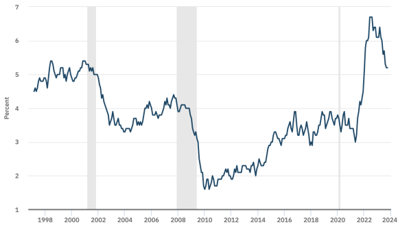 In secondo luogo, ci sono diversi dati macroeconomici fondamentali da tenere in considerazione. Tra questi, spicca la crescita dei salari nominali, che nella lettura precedente si è attestata al 5,2% sulla base della media trimestrale. Dall’andamento del grafico sottostante emerge chiaramente il declino iniziato ad agosto 2022, ma rimaniamo ampiamente al di sopra dei livelli pre-pandemici, quando la crescita si attestava al 3,8% nel gennaio 2020. Sarà importante tenere monitorata la crescita dei salari nominali, dato che esercitano un forte impatto sul lato della domanda, e un eventuale rimbalzo potrebbe innescare una nuova accelerazione dell’inflazione.