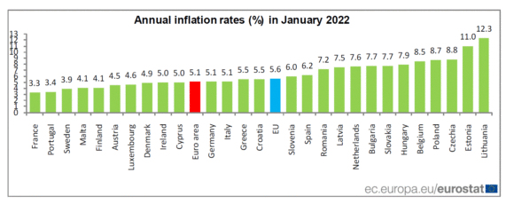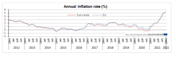 Nello stessa rilevazione di Eurostat si evidenzia inoltre il dato complessivo sull’inflazione dell’insieme Ue: +5,6% rispetto al 5,3% di fine 2021.