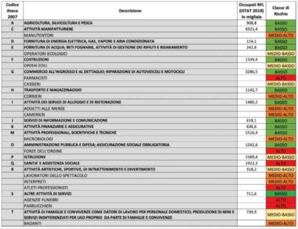 A titolo esemplificativo, il documento Inail pubblica una tabella che illustra le classi di rischio per alcuni dei principali settori lavorativi e partizioni degli stessi, nonché il relativo numero degli occupati.