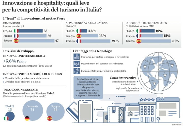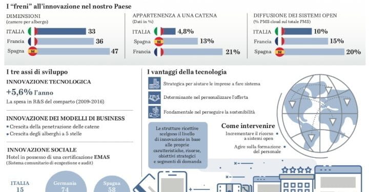 L’innovazione tecnologica, però, sta dando forti segnali di incremento: le aziende dotate di sistemi di gestione ERP (enterprise resource planning) sono passate dall’11 per cento del 2010 al 29 per cento del 2017, quelle con CRM (customer relationship management, il sistema per gestire le relazioni con i clienti) dal 37 al 48 per cento nello stesso periodo. Però, ancora nel 2016, solo il 10 per cento delle imprese italiane del settore risultava dotato di un sistema PMS cloud (il software gestionale per l’hotellerie), rispetto al 15 della Francia, il 20 della Spagna e il 32 del Regno Unito, anche se tutte, comunque, sembrano ormai aver ben compreso la stategicità della presenza on-line (il fatturato derivante dall’e-commerce di settore è arrivato al 29 per cento).