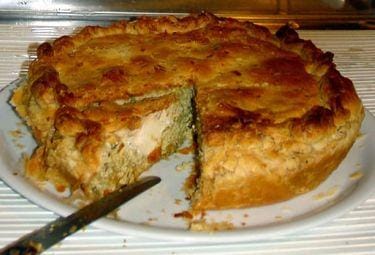 Pennellate la pasta con olio, ponete sopra un altro foglio grande e poi nuovamente un altro sempre pennellando con olio fra uno strato e l’altro. Versate sopra il ripieno, livellatelo dopodiché formate 6 fossette intorno al bordo ma a una distanza di almeno due dita da esso. Mettete all’interno un pezzettino di burro delle dimensioni di una nocciola poi sgusciate un uovo in ogni fossetta. Coprite con i due fogli più piccoli di pasta, sempre pennellati. Rivoltate i bordi della pasta più grande verso l’interno formando una specie di cordone. Cuocete in forno caldo a 190°C per 40-50 minuti.